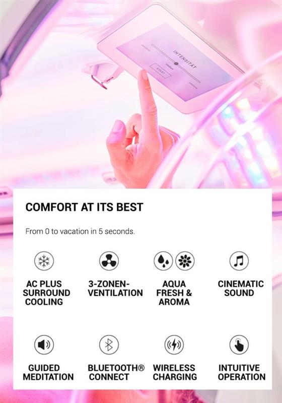 Combina o poder de cuidado da pele da luz vermelha Beauty Light com o efeito calmante da luz verde Nature Light. Para um bronzeado bonito, natural e uma sensação de bem-estar.